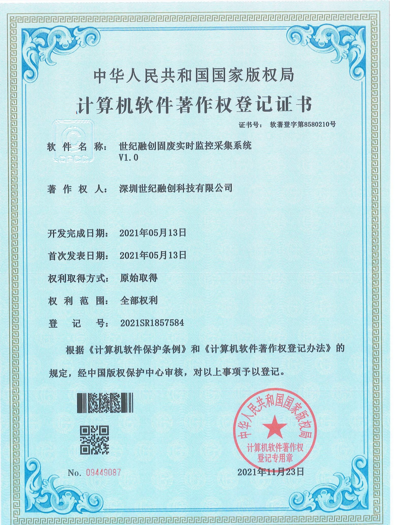 • 固废实时监控采集系统著作权证书